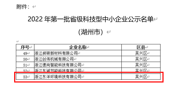 祝賀東洋環境科技評為2022年第一批省級科技型中小企業